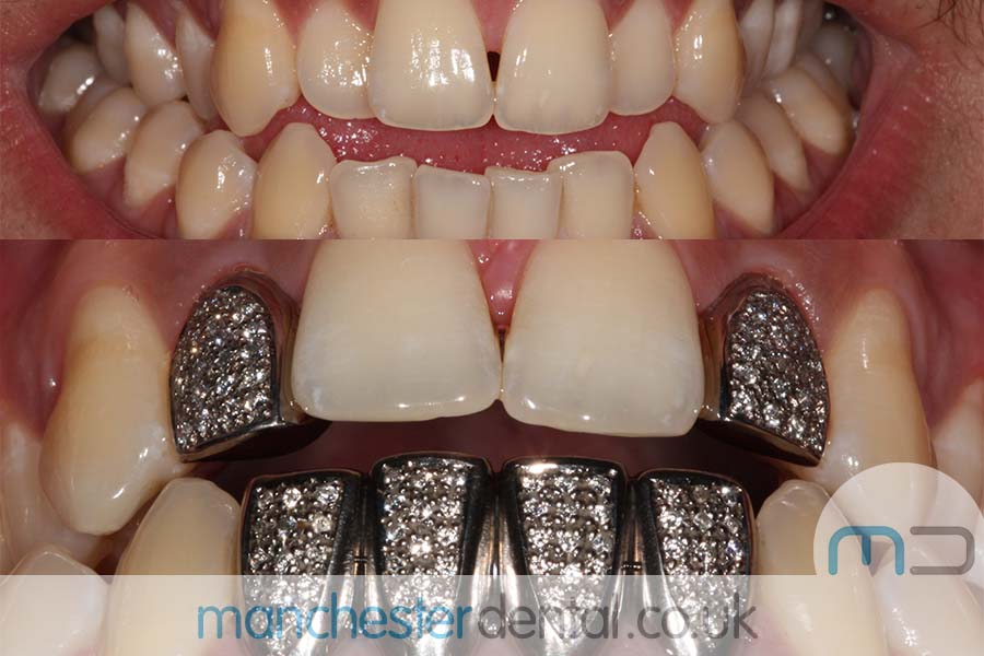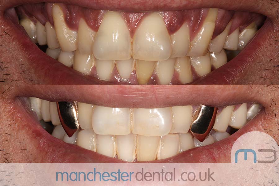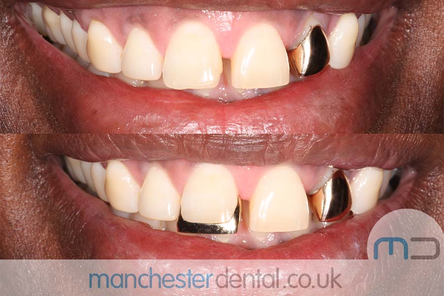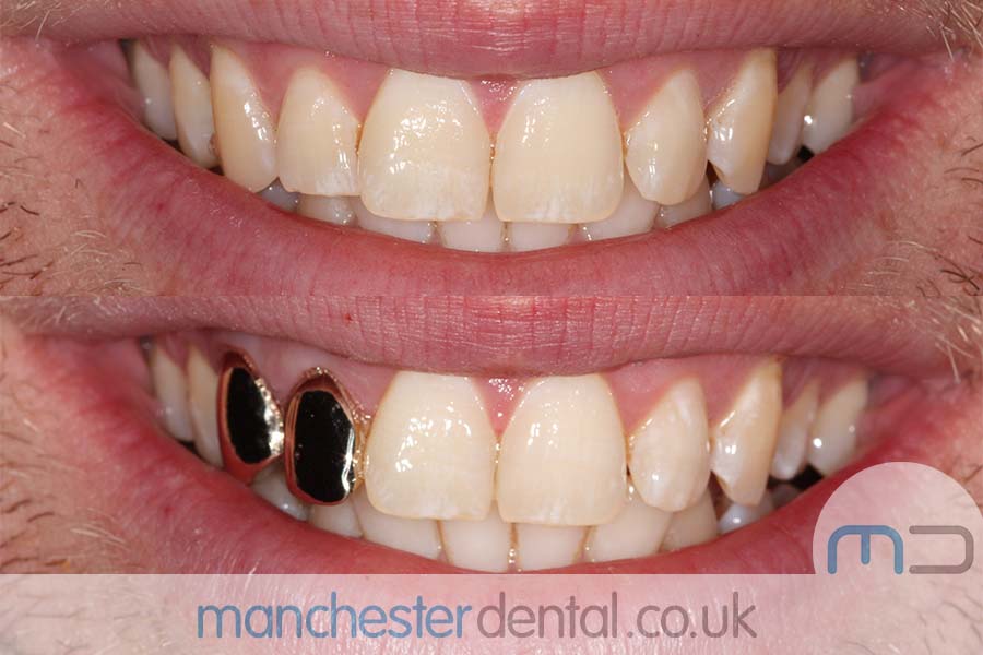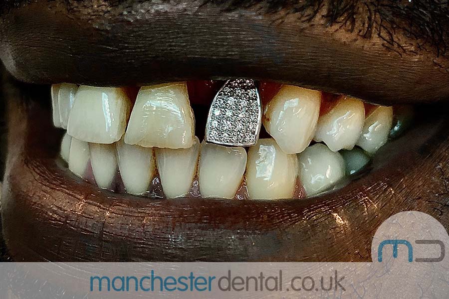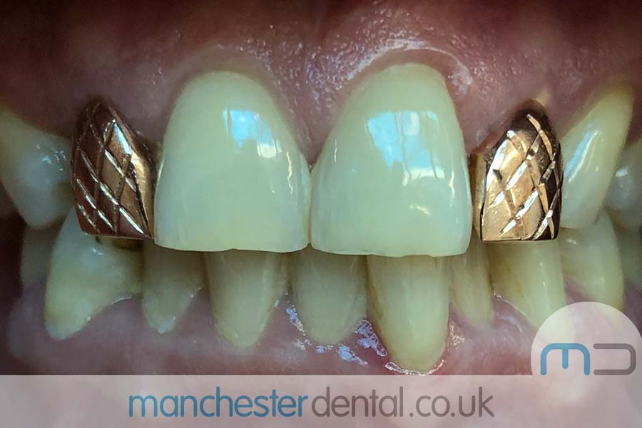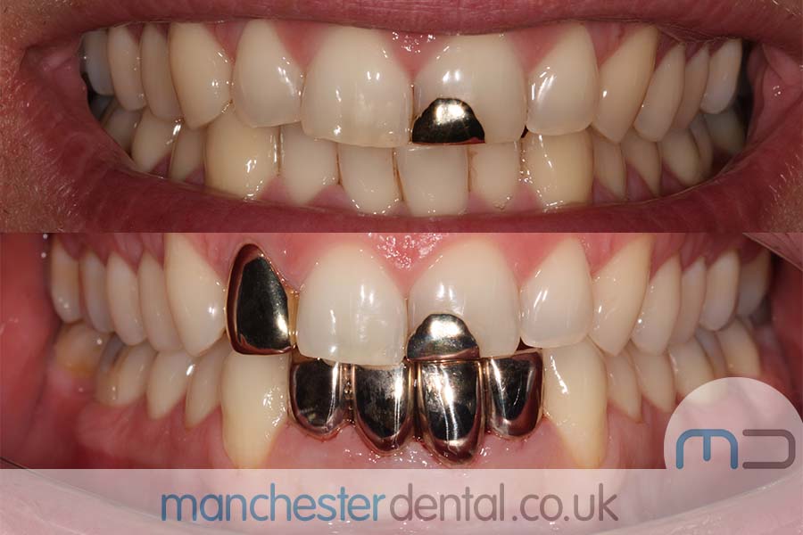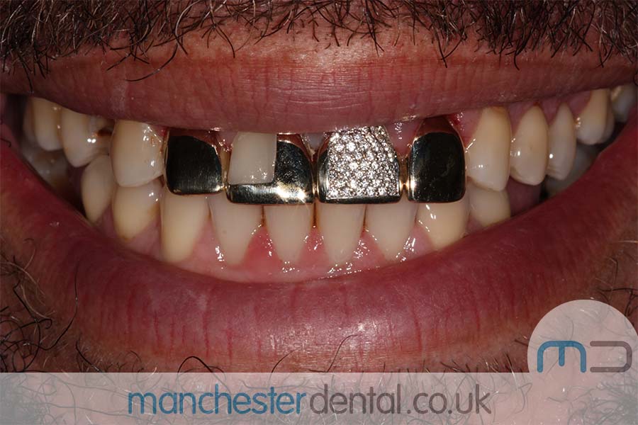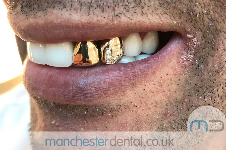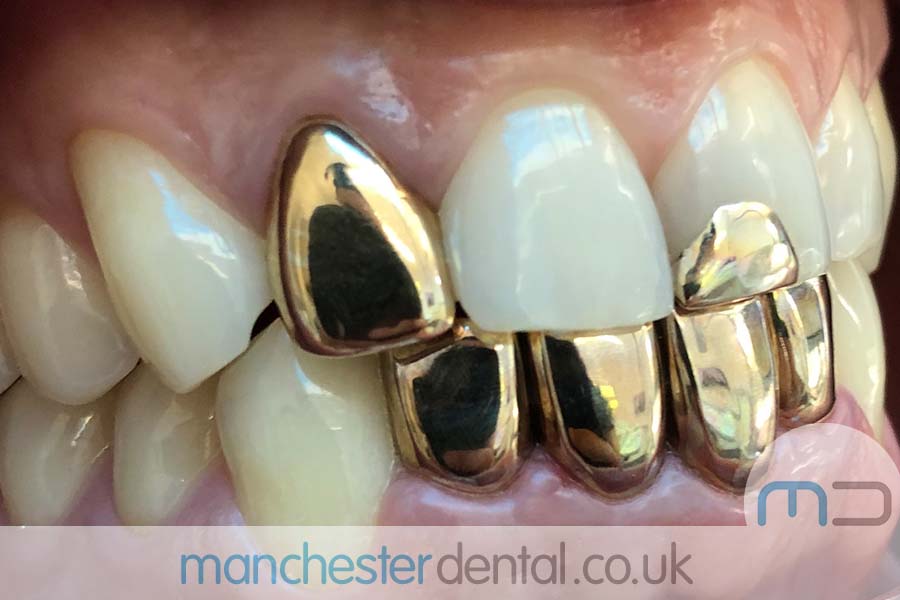 Gold teeth Manchester, with Manchester Dental! Gold teeth are a very popular type of tooth jewellery or tooth art. They are sometimes known as Gold Crowns and also Grills.